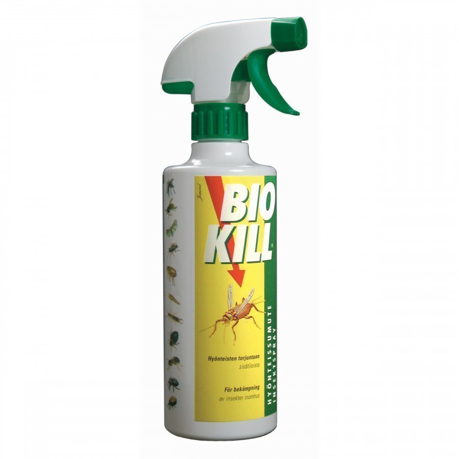 Bio Kill 480 ml torjunta-aine. Tuhohyönteisten torjuntaan sisätiloissa käyttövalmiissa ruiskupullossa. Laajatehoinen ja pitkävaikutteinen. Hyvä teho muurahaisiin. Tehoaa myös pinnoilla oleviin hyönteisiin. Kuten kovakuoriaisiin, koi-ja koisaperhosiin, ampiaisiin, torakoihin, sokeritoukkiin, muurahaisiin, kärpäsiin, hyttysiin, luteisiin ja muihin syöpäläisiin sekä niiden toukka-asteisiin. Vesipohjainen, ei tahraa, eikä haise. Käyttöohje: Ravistettava ennen käyttöä. Nestettä suihkutetaan nurkkiin, rakoihin, halkeamiin, hormeihin ja muihin vastaaviin tuholaisten olinpaikkoihin. Käsittely voidaan uusia 2-4 viikon välein. Kohteet suihkutetaan kosteiksi, mutta ei märiksi.