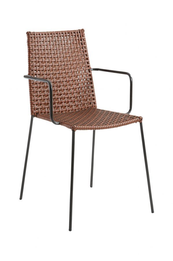Käsinojallinen tuoli, jonka runko jauhemaalattua galvanoitua terästä. Istuin ja selkänoja punottua keinonahkaa. Pinottava. Sisäkäyttöön sekä ulkokäyttöön katoksen alla. Korkeus 91 cm, leveys 56 cm, syvyys 60 cm.