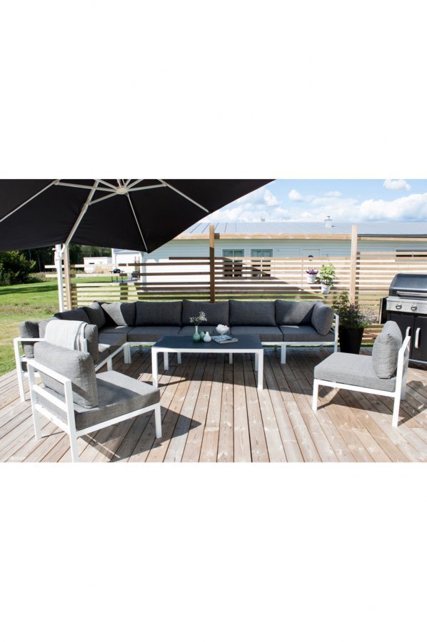 Keskiosa kulmasohvaan valkoiseksi maalattua alumiinia. Pehmuste. Korkeus: 65,5 cm Leveys: 70 cm Syvyys: 74 cm Istuinsyvyys: 72 cm Istuinkorkeus: 30 cm Istuinleveys: 70 cm Käsinojan korkeus: 35,5 cm Käsinojan leveys: 11 cm Istuintyynyn korkeus: 10 cm Istuintyynyn leveys: 70 cm Selkätyynyn korkeus: 10 cm Selkätyynyn leveys: 39 cm
