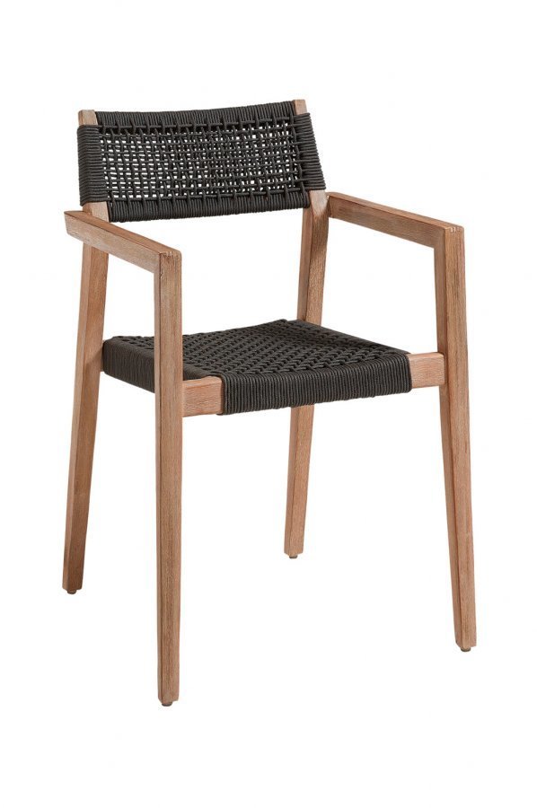Käsinojallinen tuoli, jonka runko eukalyptuspuuta. Nano-öljy ja PNZ-pinnoite antavat pitkäkestoisen UV-suojan ja parantavat tuolin kestävyyttä. Istuin ja selkänoja UV-suojattua polyesterinarua. Sisäkäyttöön sekä ulkokäyttöön katoksen alla. Korkeus 79 cm, leveys 57 cm, syvyys 54 cm.