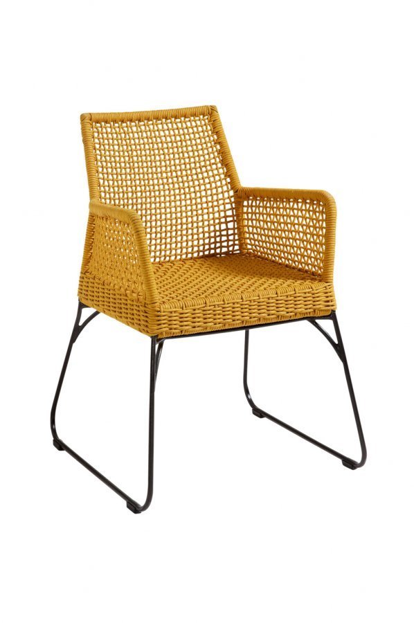 Käsinojallinen tuoli, jonka runko jauhemaalattua, galvanoitua terästä. Istuin ja selkänoja UV-suojattua polyesterinarua. Sopii sisäkäyttöön sekä ulkokäyttöön katoksen alla. Korkeus (cm) + Leveys (cm) + Syvyys (cm) + Tilavuus (m³) + Paino (kg): 80 + 59 + 59 + 0,136 + 6,3