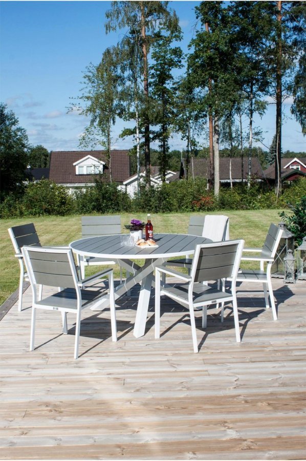 Pyöreä pöytä, jossa aintwood-pöytälevy. Ø 140 cm Korkeus: 77 cm Pöydänjalkojen välinen etäisyys (pitkällä sivulla): 115 cm Pöydänjalkojen välinen etäisyys (lyhyellä sivulla): 94 cm Pöytälevyn korkeus 72 cm Pöytälevyn paksuus: 5 cm Istumapaikkojen lukumäärä 6.