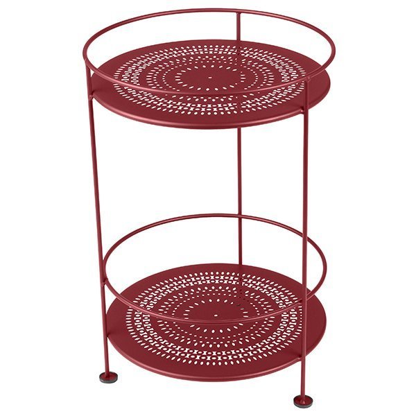 Fermobin Gueridons on pieni kaksikerroksinen pöytä, jonka pyöreissä terästasoissa on kaunis perforoitu kuvio. Koska pöydän pinnassa on erityinen UV-säteilyltä suojaava jauhemaalaus, kaluste soveltuu erinomaisesti myös ulkokäyttöön. Gueridons toimii niin pienenä sivupöytänä kahville ja virvokkeille kuin jalustana terassin tai parvekkeen ruukkukasveillekin.