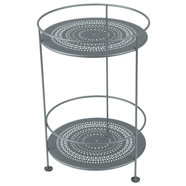 Fermobin Gueridons on pieni kaksikerroksinen pöytä, jonka pyöreissä terästasoissa on kaunis perforoitu kuvio. Koska pöydän pinnassa on erityinen UV-säteilyltä suojaava jauhemaalaus, kaluste soveltuu erinomaisesti myös ulkokäyttöön. Gueridons toimii niin pienenä sivupöytänä kahville ja virvokkeille kuin jalustana terassin tai parvekkeen ruukkukasveillekin.