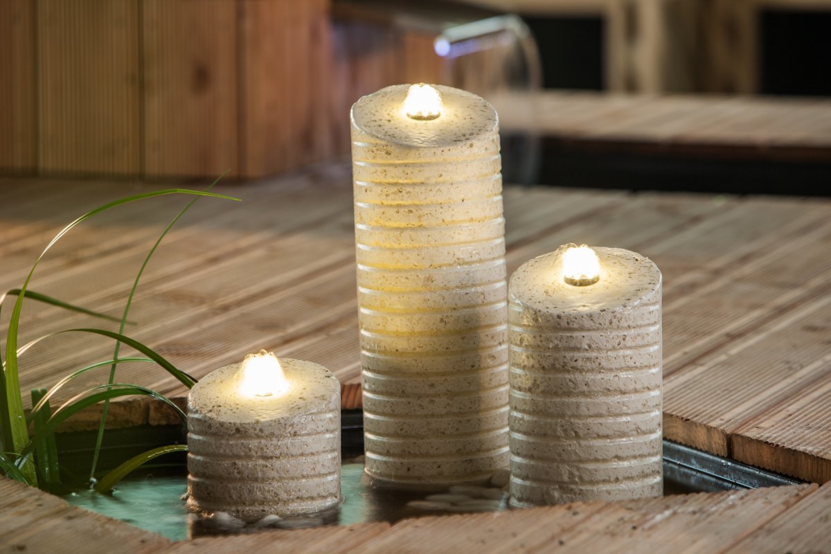 Helppo, klassinen ja kaunis suihkukaivo 3 valkoisella pyöreällä pilarilla. Setti on helppo, lisää vain vesi ja sähkö. Setissä mukana pilarit, niiden päällä LED-valo, pumppu 1000l/h 24 w, allas 38x38x17 cm. Pylväiden mitat: korkeus 13/22/35 cm