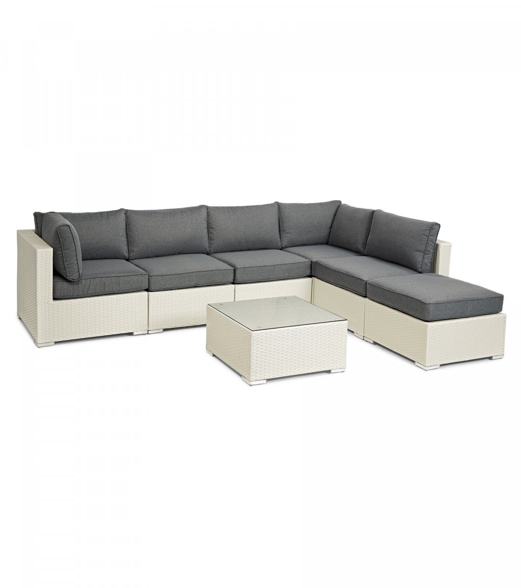 KOODI XL -palasohva koostuu 3 tuolipalasta, 2 kulmapalasta, rahista ja pöydästä. Tilaa terassillesi helppohoitoiset muovirottinkikalusteet!