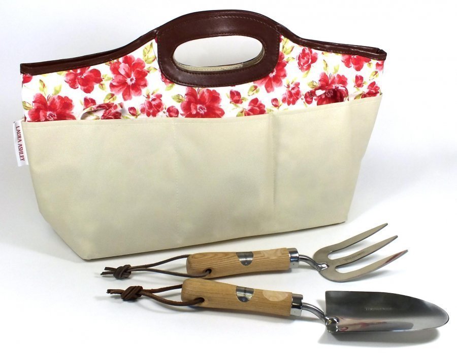 Kukkakuosinen puutarhalaukku. Laukussa mukana istutuslapio sekä istushara. Työkaluissa puinen kahva sekä ripustuslenkki. Laukun leveys 50 cm.
