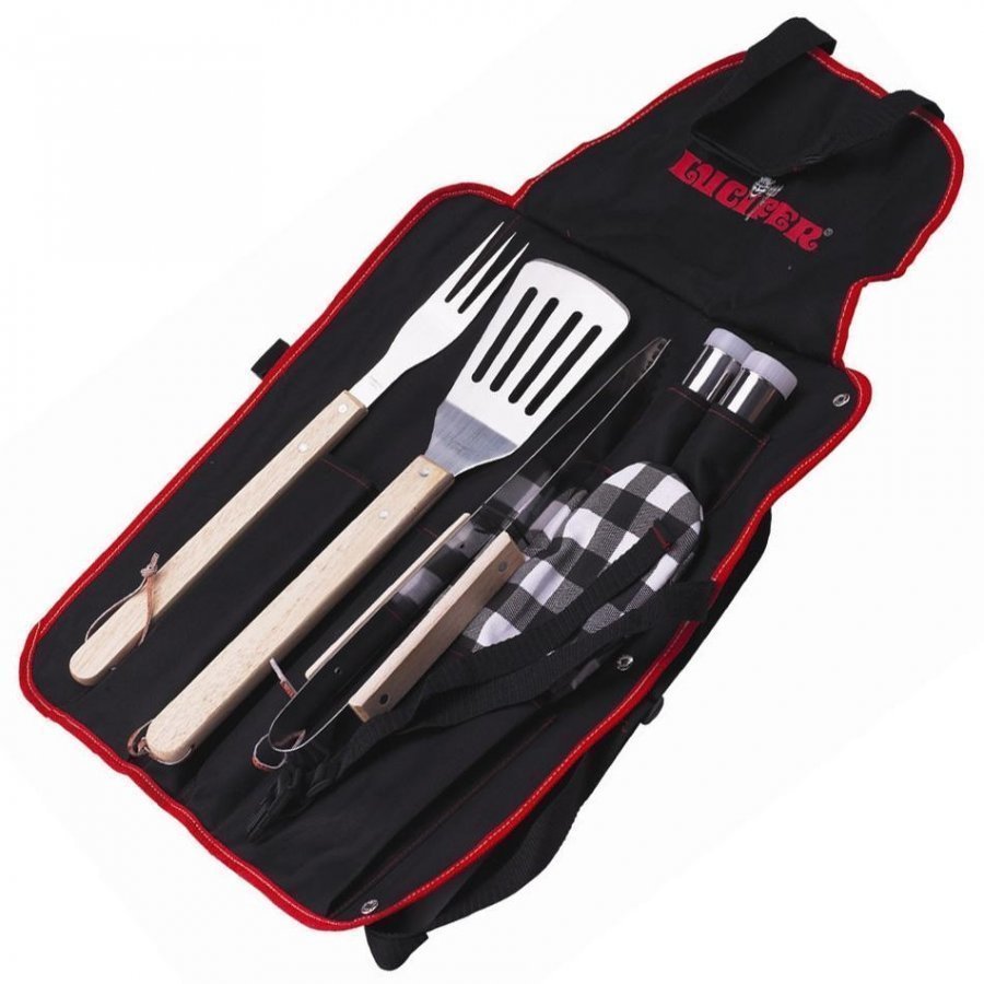 Lucifer Essu sisältää kaikki grillauksen tarvittavat välineet! Essusta löytyy seuraavat välineet; pihdit, haarukka, lasta, kinnas suola-&pippuri sirotin sekä tietenkin itse essu!.
