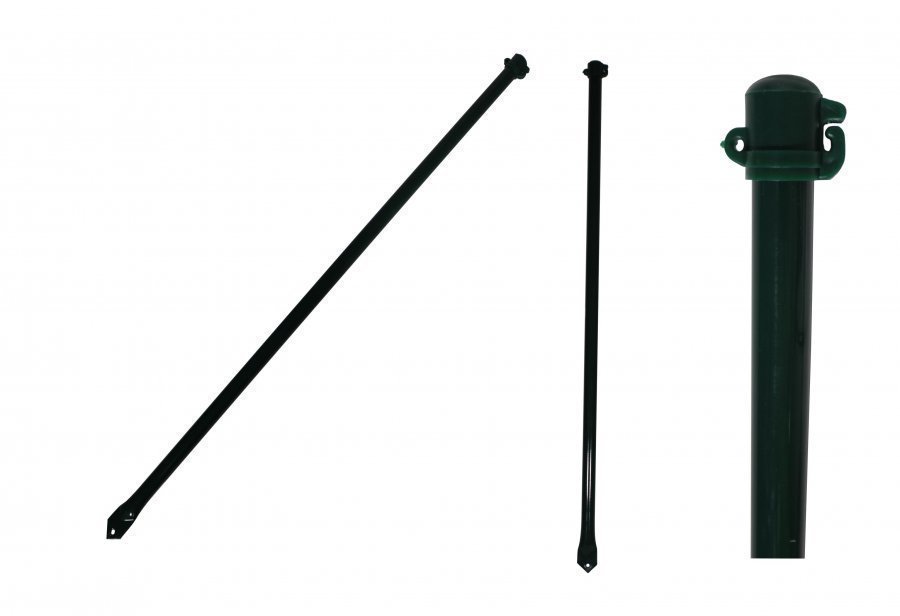 Muovipinnoitettu metallinen aitatolppa, vihreä. Aitatolpan päässä kiinnike verkolle.
