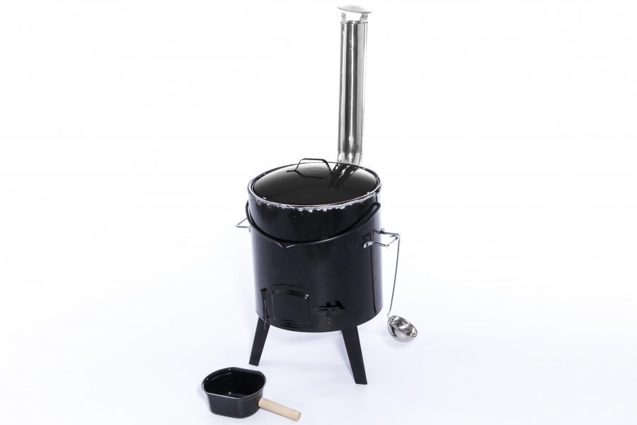 – läpimitta 35 cm. – emaloitu soppatykki. – kokonaismitat: 44 x 94 x 48 cm. – emaloitu kansi kahvalla. – kromattu savuhormi 78 x 360 mm. – hiiliritilä läpimitta 32,6 cm. – tuhka-astia, teräskauha ja 3 emaloitua jalkaa. – vetoisuus n. 9 l.