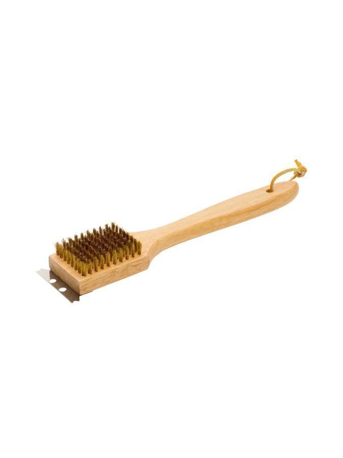 Kaksitoimisessa grilliharjassa on harja ja raaputusosa. Varsi on puuta ja sen päässä on ripustuslenkki.