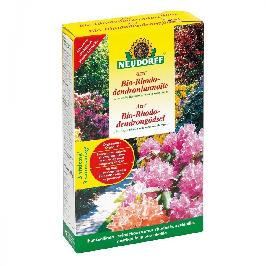 Neudorff Azet 1 kg bio-rhododendronlannoite. Happamassa maaperässä viihtyville kasveille tarkoitettu typpipitoinen, magnesiumia sisältävä eloperäinen lannoite. Parantaa kasvua ja kukintaa sekä talvenkestävyyttä. Ehkäisee kasvitauteja. Annostellaan keväällä ja kesällä rodoille ja azaleoille 1 kg/10 m2. Ei huuhtoudu vesistöihin.