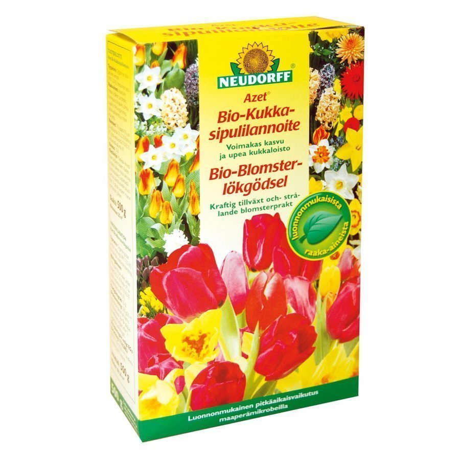 Neudorff Azet 500 g bio-kukkasipulilannoite. Nyt kukkasipuleille oikea lannoite!. Bio kukkasipulilannoite aikaansaa voimakkaan kasvun ja upean kukkaloiston. Orgaaninen pitkävaikutteinen lannoite luonnonmukaisista raaka-aineista. Mykorritsa-sienirihmaston ansiosta voimakas ja terve kasvu. Sisältää maaperämikrobeja. Sopii kaikille kukkasipuleille ja kasvien mukuloille. Sisältää rautaa ja magnesiumia sekä muita hivenaineita. Parhaan vaikutuksen mikrobeja sisältävällä Bio- kukkasipulilannoitteella saat lievästi happamessa tai neutraalissa maaperässä pH-arvon ollessa 5,5 – 7.