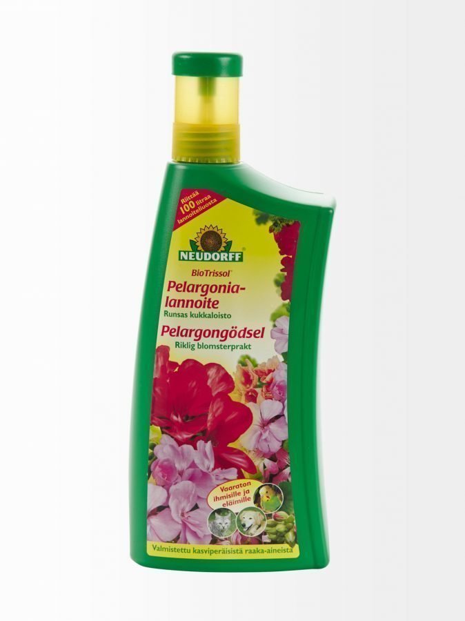 Bio Trissol -pelargonialannoite on kasviperäisistä raaka-aineista valmistettu nestemäinen kestolannoite pelargoneille parvekkeilla, verannoilla ja puutarhoissa. Vaaraton ihmisille, eläimille ja ympäristölle. Pakkauskoko 1 l.
