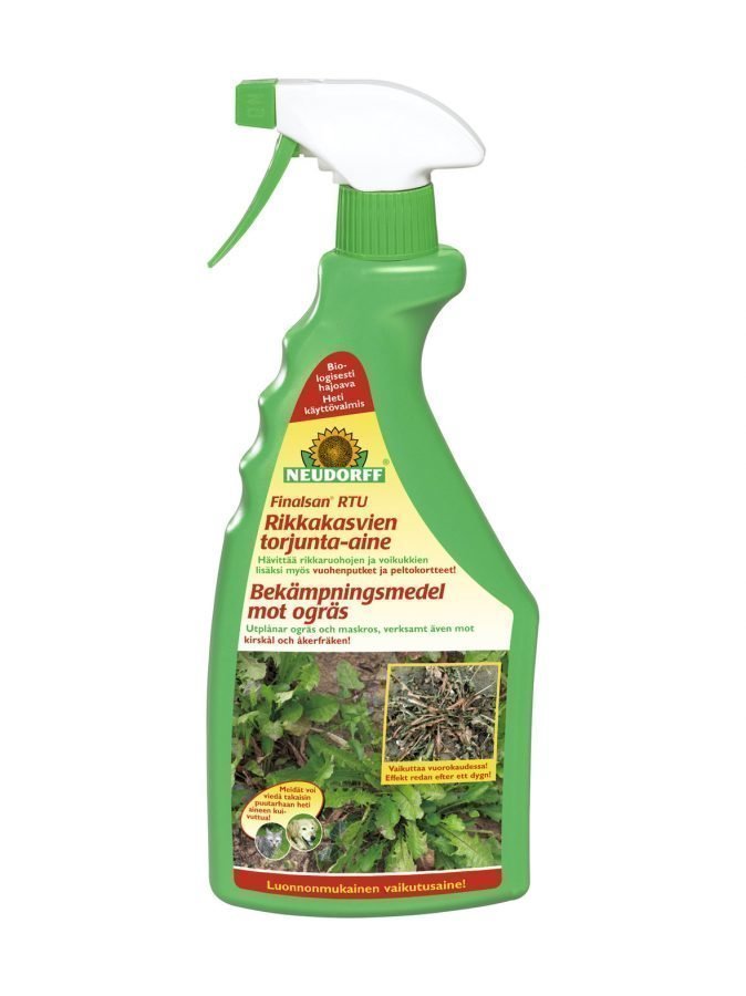 Luontoperäinen ja biohajoava tehoaine torjuu yksi- ja kaksivuotisia rikkakasveja tehoten myös vuohenputkea, peltokortetta, sammalta sekä leviä vastaan. Aine vaikuttaa jo muutaman tunnin kuluessa ja toimii myös matalissa lämpötiloissa. Soveltuu käytettäväksi pihalla ja puutarhassa. Suihkepullo 750 ml.