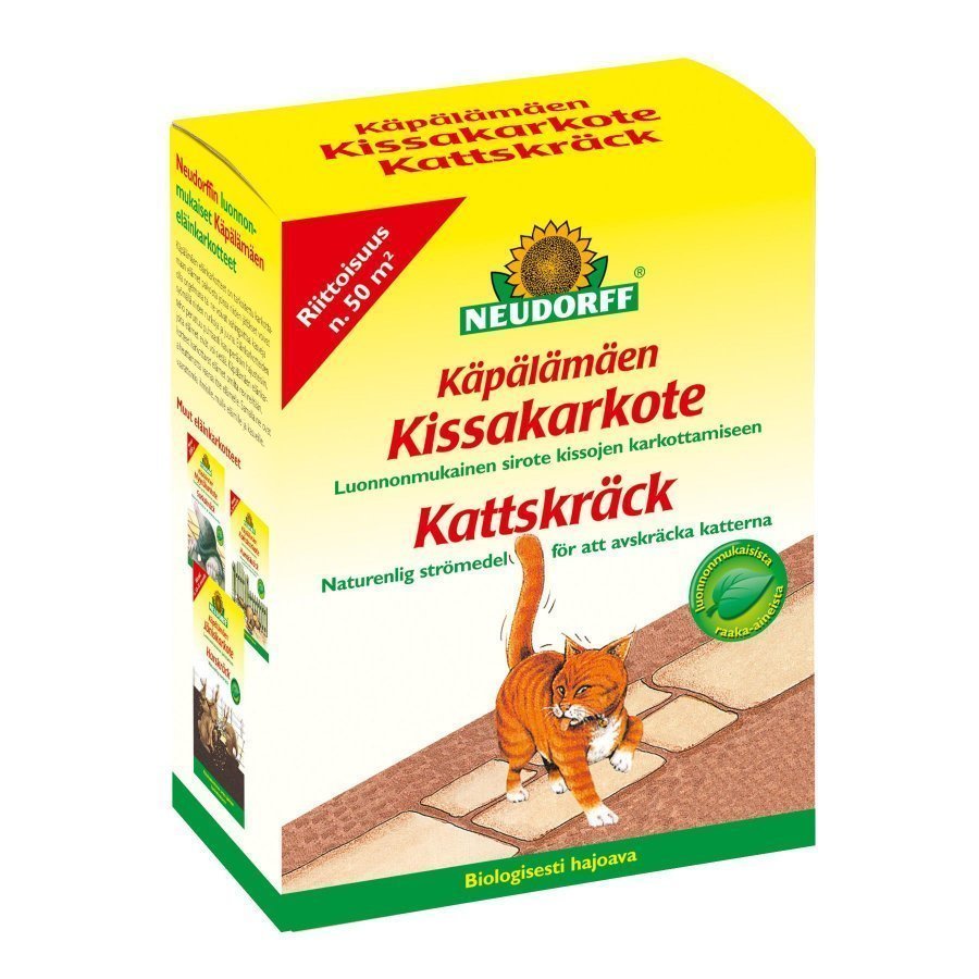 Neudorf Käpälämäen 200 g kissakarkote. Sisältää puhtaasti kasvipohjaisia hajusteita ja estää tehokkaasti kissoja merkitsemästä reviirejään. Pitkään kestävä tuoksu karkottaa kissat tehokkaasti pihoilta, terasseilta sekä lintujen syöttöpaikoilta. Luonnonmukainen karkote.