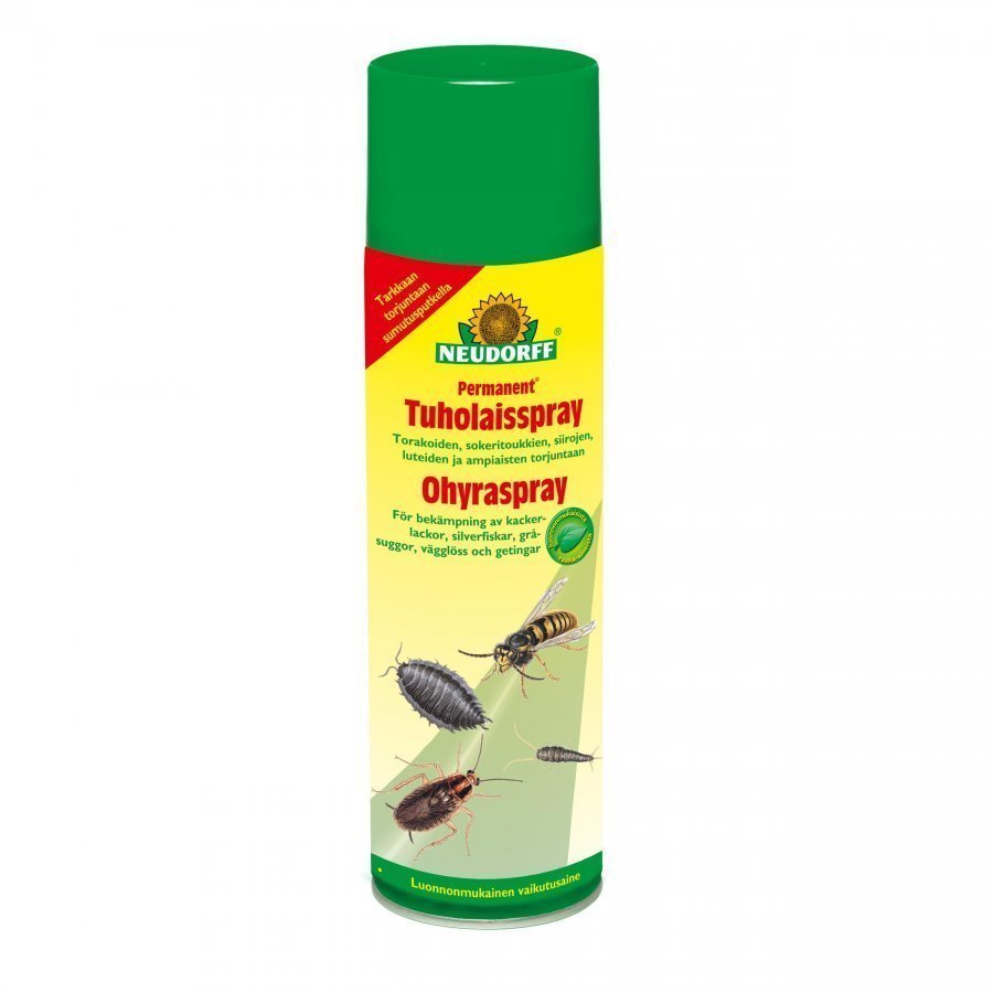Permanent 500 ml tuholaisspray. Permanent Tuholaisspray on tarkoitettu kaikkien ryömivien tai lentävien hyönteisten torjuntaan sisätiloissa. Heti vaikuttava ja sen lisäksi vaikutus säilyy tehokkaana 6 viikkoa suihkutetuilla pinnoilla. Soveltuu kaikille kodin tuholaisille: torakat, sokeritoukat, siirat, luteet ja ampiaiset. Käyttökohteena ovat WC, kylpyhuoneet, pesutuvat, kellarit, autotallit, kesämökit ja karjasuojat. Vaikuttaa heti + kuuden viikon kestovaikutus. Riittää n. 20 m²:lle.