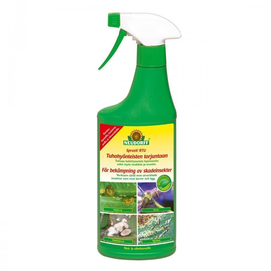 Spruzit RTU tuhohyönteisten torjunta-aine. Heti käyttövalmis. Tehoaa myös toukkiin ja muniin sisällä ja ulkona!. Tehokas, uuden sukupolven luonnonmukainen torjunta-aine haitallisten tuhohyönteisten torjuntaan: Spruzit. Luonnonmukainen Spruzit Tuhohyönteisten torjunta-aine on helppokäyttöinen ja laaja-alaisesti vaikuttava ruiskute vahingollisten, imevien hyönteisten torjuntaan. Spruzit on tarkoitettu sekä sisällä oleville viherkasveille että kaikille kasveille ulkona ja kasvihuoneessa. Spruzit sopii myös koristepuille, hedelmäpuille ja vihanneksille!. Spruzit tuhoaa lehtikirvat, kilpikirvat, villakilpikirvat, harsosääsket, jauhiaiset, ripsiäiset, kovakuoriaiset, kaskaat, poppelin salaattikirvat, hernekääriäiset, kovakuoriaisten toukat, toukat, lehtipistiäistoukat, luteet , havupunkit, rhododendronin verkkoluteet sekä kehrääjäpunkit avomaalla, kasvihuoneissa, toimistoissa ja sisätiloissa kotona. Luonnonpyretriinin ja rapsiöljyn yhdistelmä torjuu hyönteiset, niiden toukat ja munat.