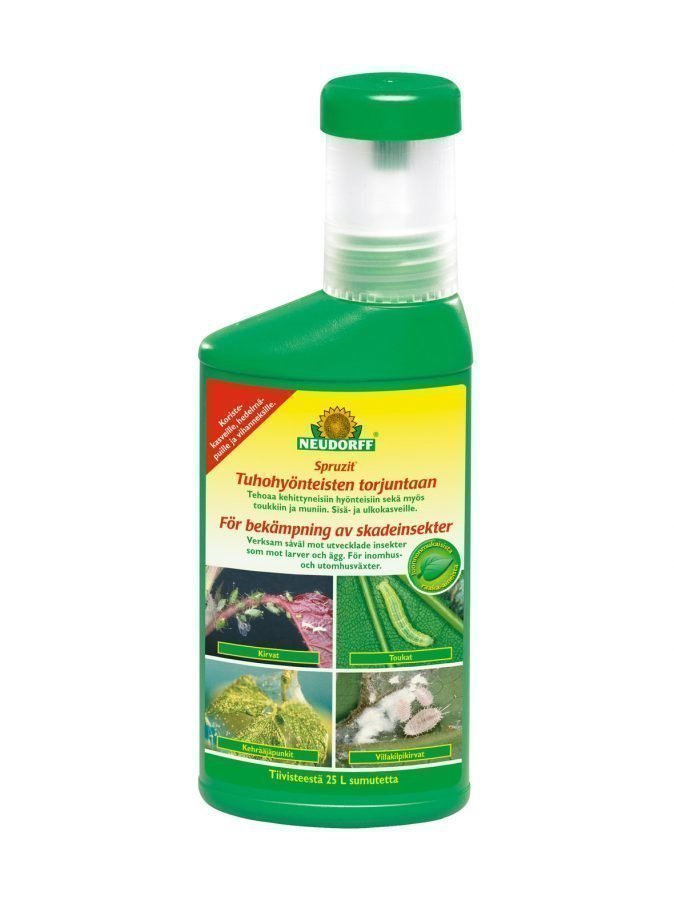 Spruzit on tehokas ja luonnonmukainen torjunta-aine haitallisten tuhohyönteisten torjuntaan. Torjunta-aine on helppokäyttöinen ja laaja-alaisesti vaikuttava ruiskute vahingollisten, imevien hyönteisten torjuntaan. Spruzit on tarkoitettu sekä sisällä oleville viherkasveille että kaikille kasveille ulkona ja kasvihuoneessa. Spruzit sopii myös koristepuille, hedelmäpuille ja vihanneksille. Spruzit tuhoaa lehtikirvat, kilpikirvat, villakilpikirvat, harsosääsket, jauhiaiset, ripsiäiset, kovakuoriaiset, kaskaat, poppelin salaattikirvat, hernekääriäiset, kovakuoriaisten toukat, toukat, lehtipistiäistoukat, luteet, havupunkit, rhododendronin verkkoluteet sekä kehrääjäpunkit avomaalla, kasvihuoneissa, toimistoissa ja sisätiloissa kotona. Luonnonpyretriinin ja rapsiöljyn yhdistelmä torjuu myös hyönteisten toukat ja munat. Laimennettava tiiviste.