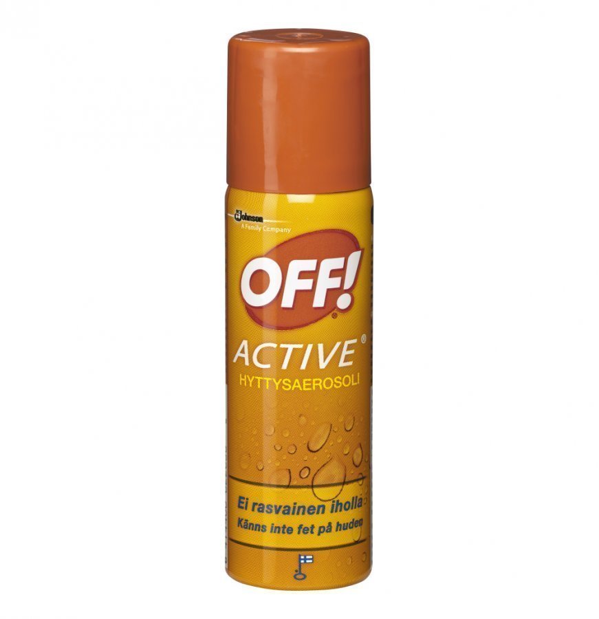 Älä huido, ota OFF! Suomen suosituin hyttyskarkote. OFF! Active hyttysaerosoli sopii käytettäväksi iholla ja vaatteilla. Helppokäyttöinen. Ei jätä rasvaista tuntua iholle. Pakkauskoko 65 ml. Aerosoli antaa 4 5 tunnin suojan iholla. Vaatteissa suoja kestää jopa useita vuorokausia. Huomioi, että hikoilu laimentaa tuotteen tehoa. Käyttö:Sumuta aerosolia noin 20 cm:n etäisyydeltä. Älä kallista sumuttaessasi tölkkiä yli vaakatason. Vältä aineen hengittämistä. Aerosolia on kätevää sumuttaa vaatteille,. . .