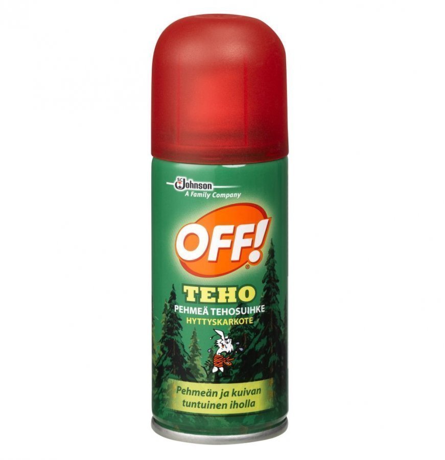 Älä huido, ota OFF! Suomen suosituin hyttyskarkote. OFF! Pehmeä tehosuihke on uudenlainen kuivasuihke. Se toimii muuten kuten perinteinen aerosoli, mutta suihke on niin hienojakoista, että iholle suihkutettaessa se kuivuu välittömästi ja tuote on näin erittäin miellyttävä käyttää. Tuote karkottaa hyttysten lisäksi punkit, paarmat ja mäkäräiset ja sopii hyvin metsästäjille, kalastajille ja muille aktiivisille ulkoilijoille. Antaa 5-6 tunnin suojan ja sopii vaativampiin hyttysolosuhteisiin. Teh. . .