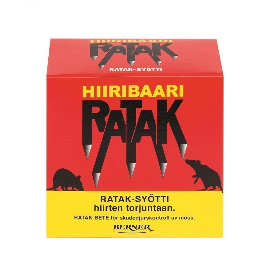Ratak 30 g hiiribaari syöttirasia. Kauraryynisyöttirasia, ”hiiribaari” hiirien torjuntaan. Syöttiä käytetään sellaisenaan vähintään 10 vrk. Käyttöohje: 30 g syöttirasia: Leikkaa syöttirasian sisällä olevan pussin kulma auki ja sulje kotelo. Puhkaisen reiät ja aseta syöttirasia vaakatasoon. Syöttiä syöneet hiiret kuolevat 4-10 päivän kuluttua tappavan annoksen syömisestä, mihin voidaan tarvita kaksi tai useampia syöntikertoja.