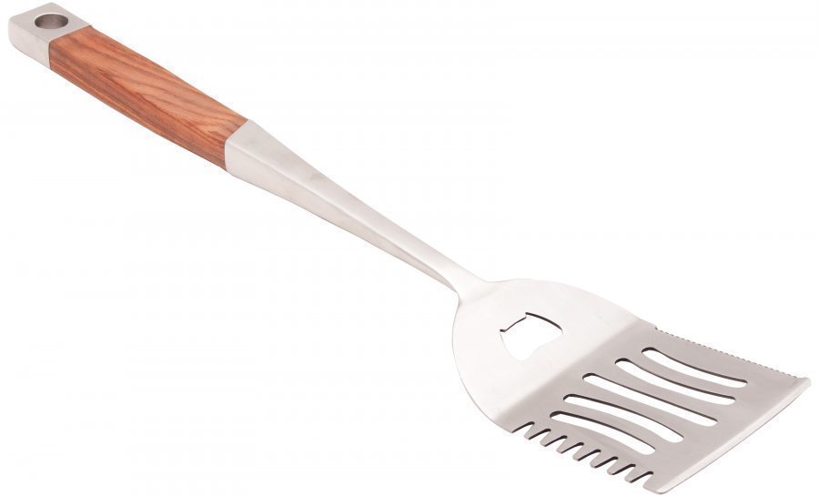 Muotoiluun ja tuntumaan on panostettu tässä grillauksen toiseksi tärkeimmässä työvälineessä. Rosterivartinen grillilasta on tukeva ja sen lastaosassa on sahalaitainen paloittelureuna, jolla saa tarvittaessa paloiteltua grilliherkut jo grillissä sopivan kokoisiksi paloiksi. Lisäksi lastaosassa on kruunukorkille pullonavaaja. Tämä grillilasta on todellinen grillimestarin monitoimityökalu!… Lue lisää »