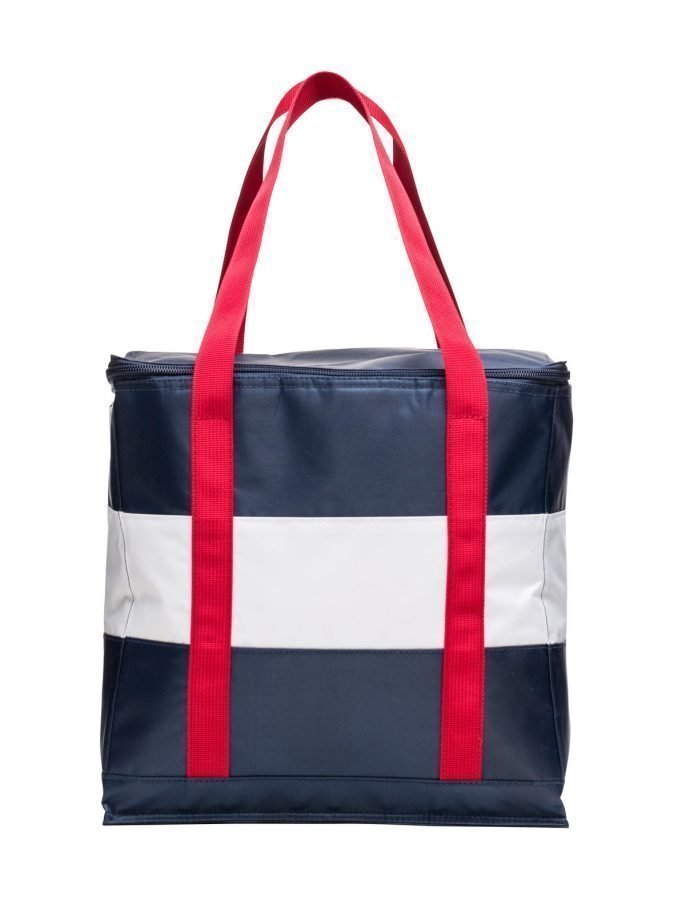 Pakkaa piknik-eväät raikkaan raidalliseen kylmälaukkuun. Laukussa on vetoketjukiinnitys ja leveät kantokahvat. Materiaali on polyesteriä.