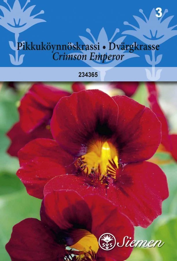 Tropaeolum minus ’Crimson Emperor’. Yksivuotinen. Kukkii runsaasti syvänpunaisin kukin. Tummanvihreät lehdet. Korkeus 30-35