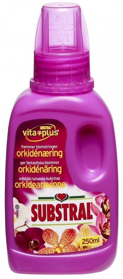 Substral Orkidearavinne on kasteluveteen sekoitettava erikoislannoiteneste kaikille orkidealajikkeille. Substral Orkidearavinne tehostaa kukintojen kehitystä ja pidentää kukkien väriloistoa. Nestemäisen ravinteen etu on se, että orkideat saavat liukoisessa muodossa olevat ravinteet heti käyttöönsä. Substral Vita-Plus ainutlaatuisessa koostumuksessa on kaikki orkidean kannalta tärkeät pää- ja hivenravinteet. Tuotetiedot. NPK-lannoiteliuos 4+2+6,6, sisältää hivenravinteita. Vähäkloorinen. Ravinnepitoisuudet:. – typpi (N) 4 %. – fosfori (P) 2 %. – kalium (K) 6,6%. Käyttöohje. Sekoita 1/4 korkillista (7 ml) litraan vettä. Käytä lannoitetta maalis-syyskuussa 2-3 viikon välein ja loka-helmikussa 4-6 viikon välein. Ota huomioon lajikekohtaiset vaatimukset!.