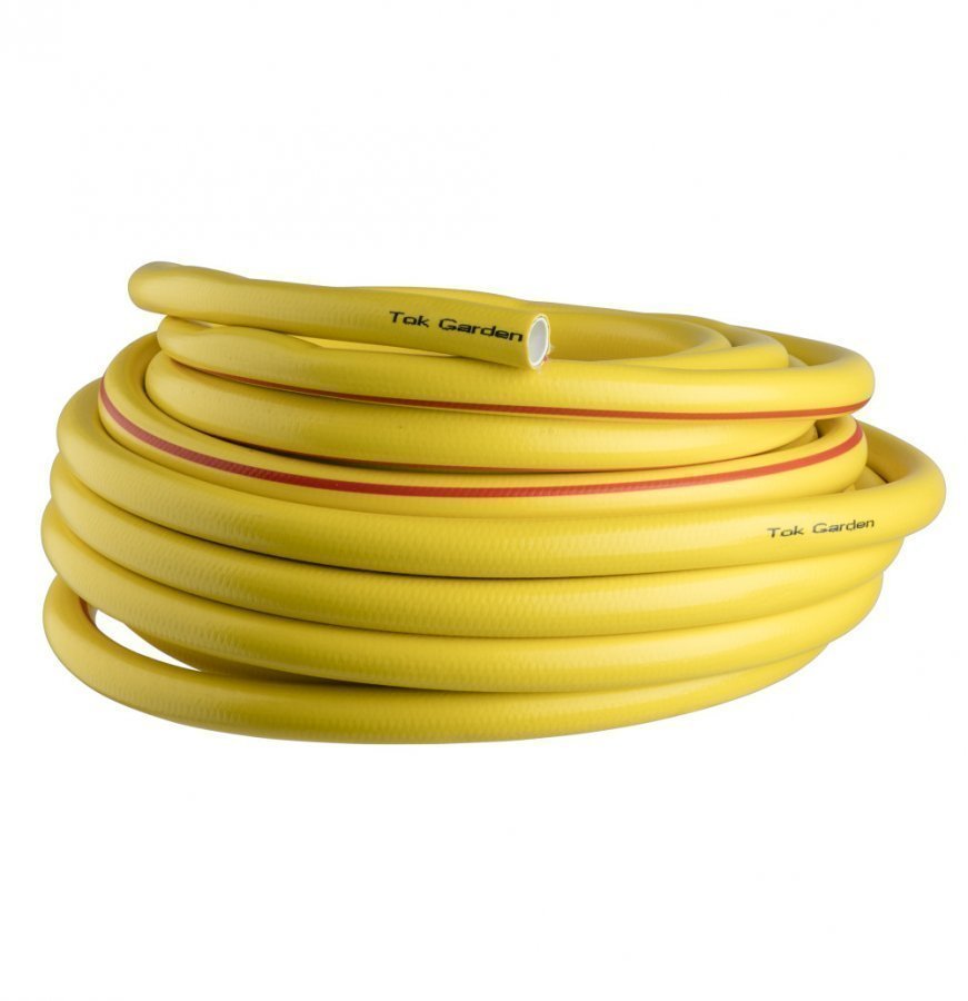 Kiertymätön TokGarden Heavy Duty-kasteluletku. Materiaali 5-kerrosta vahvistettua PVC:tä. UV-kestävä. Ei sisällä kadmiumia, bariumia. Kalkkia hylkivä. Kasteluletkun koko on 20 m 3/4″ halkaisija 15 mm. Max paine 24 bar. Väri keltainen.