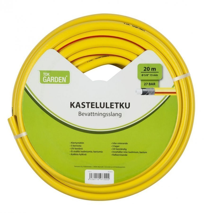 TOK GARDEN kasteluletku. Kiertymätön, UV-kestävä, kalkkia hylkivä. Letkun pituus 20 metriä. Halkaisija 5/8″. Ei sisällä kadmiumia eikä bariumia. Väri keltainen. Ominaisuudet: – 5 kerrosta- 27 bar- Ø 5/8″ 15 mm