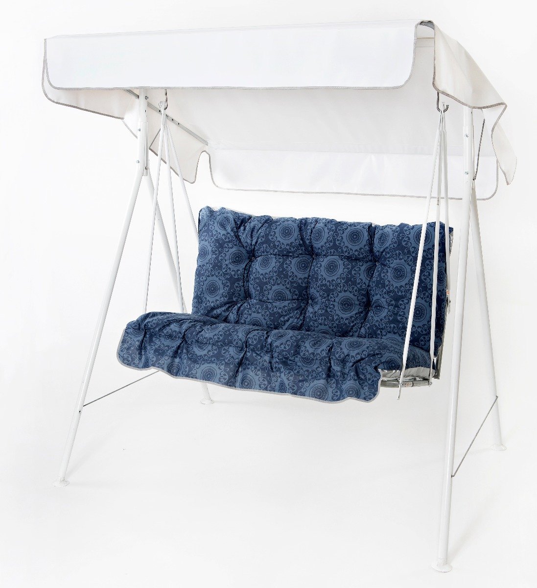 Kahden hengen puutarhakeinussa on kestävä teräsrunko, rimpsureunaiset pehmusteet ja vilvoittava katos.